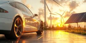 Sustainable Future: Modern Electric Car Parked on Solar Panels with Wind Turbines in the Background at Sunset