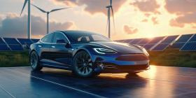 Sustainable Future: Modern Electric Car Parked on Solar Panels with Wind Turbines in the Background at Sunset
