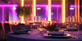 Elegant Dining Table Setup in Modern Event Space: Neatly Arranged Wine Glasses, Plates, Napkins, Cutlery, Candles, and Floral Centerpiece