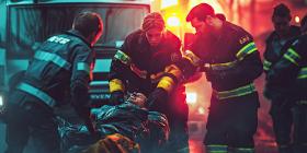 Heroic Firefighters in Action: Team of Brave Firefighters Rescuing an Injured Person Amidst Flames and Debris During a Chaotic Emergency Response