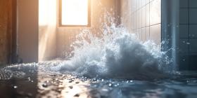 Water erupts in a dynamic explosion, sending a shower of droplets cascading through the air, capturing the raw power and unpredictable nature of the natural world