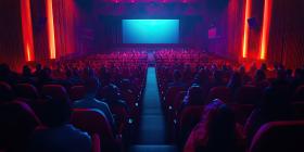 Crowded Movie Theater with People Seated Facing a Blank Screen in a Modern, Comfortable Setting with Blue and Orange Lighting