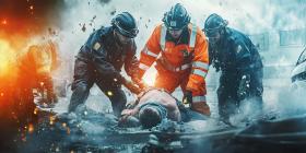 Heroic Firefighters in Action: Team of Brave Firefighters Rescuing an Injured Person Amidst Flames and Debris During a Chaotic Emergency Response