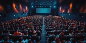 Crowded Movie Theater with People Seated Facing a Blank Screen in a Modern, Comfortable Setting with Blue and Orange Lighting