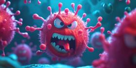 Cartoonish depiction of a coronavirus, its spikes resembling menacing tentacles and its expression one of pure aggression, serves as a lighthearted reminder of the ongoing battle against this invisible enemy