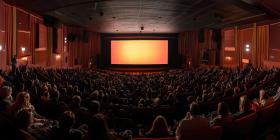 Crowded Movie Theater with People Seated Facing a Blank Screen in a Modern, Comfortable Setting with Blue and Orange Lighting