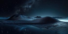 A breathtaking panorama of a moonlit landscape, where snow-capped mountains rise majestically above a tranquil lake
