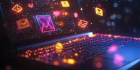 A laptop screen is awash with a flurry of colorful email icons, symbolizing the rapid flow of information and the constant connectivity of the digital age