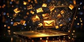 A laptop screen is awash with a flurry of colorful email icons, symbolizing the rapid flow of information and the constant connectivity of the digital age