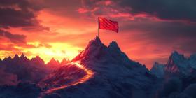 Reaching for the Summit: A winding path, illuminated by a fiery glow, leads to a peak crowned by a fluttering flag