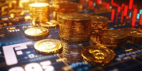 Stacks of gleaming Bitcoin coins rest atop a dynamic chart, symbolizing the volatile yet alluring world of cryptocurrency and the pursuit of digital wealth