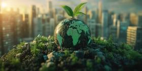 A futuristic cityscape emerges from a lush canopy of trees, showcasing a vision of sustainable urban living where nature and technology coexist in harmony