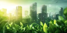 A vibrant city skyline emerges through a frame of lush greenery, capturing the beauty of nature thriving amidst the urban landscape