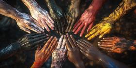 A vibrant tapestry of hands, painted in a spectrum of colors, reaching towards a central point, symbolizes the power of collective action and the beauty of human diversity