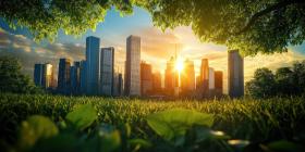 A vibrant city skyline emerges through a frame of lush greenery, capturing the beauty of nature thriving amidst the urban landscape