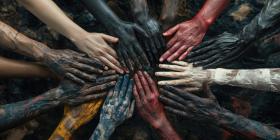A vibrant tapestry of hands, painted in a spectrum of colors, reaching towards a central point, symbolizes the power of collective action and the beauty of human diversity
