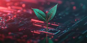A vibrant green sprout emerges from a futuristic circuit board, symbolizing the symbiotic relationship between nature and technology and the potential for sustainable innovation