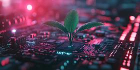 A vibrant green sprout emerges from a futuristic circuit board, symbolizing the symbiotic relationship between nature and technology and the potential for sustainable innovation