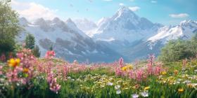 A breathtaking vista of a vibrant alpine meadow, carpeted with a kaleidoscope of wildflowers, stretches towards a backdrop of snow-capped mountains under a bright summer sky