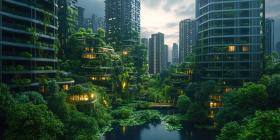 A vibrant city skyline emerges through a frame of lush greenery, capturing the beauty of nature thriving amidst the urban landscape