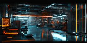 A futuristic industrial space bathed in a mesmerizing interplay of neon lights, where metallic structures and reflective surfaces create a mesmerizing and otherworldly atmosphere