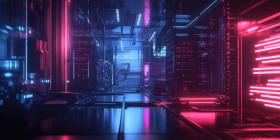 A futuristic industrial space bathed in a mesmerizing interplay of neon lights, where metallic structures and reflective surfaces create a mesmerizing and otherworldly atmosphere