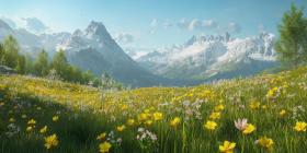 A breathtaking vista of a vibrant alpine meadow, carpeted with a kaleidoscope of wildflowers, stretches towards a backdrop of snow-capped mountains under a bright summer sky