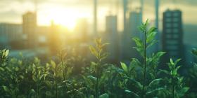 A vibrant metropolis awakens under the golden rays of the rising sun, its towering skyscrapers surrounded by a lush canopy of trees, showcasing the harmonious coexistence of urban life and nature