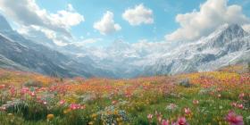 A breathtaking vista of a vibrant alpine meadow, carpeted with a kaleidoscope of wildflowers, stretches towards a backdrop of snow-capped mountains under a bright summer sky