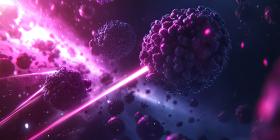 Two celestial bodies, illuminated by intersecting beams of light, engage in a cosmic dance, their surfaces crackling with energy and hinting at the vast and dynamic forces of the universe