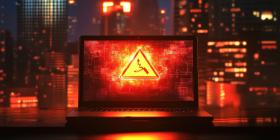 A laptop screen glows with an ominous red warning sign, casting a stark shadow in a dimly lit room, serving as a stark reminder of the ever-present threat of cyberattacks in our increasingly connected world