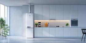 Sunlight streams through a window, illuminating a modern kitchen with a sleek refrigerator as its centerpiece. The warm light casts a welcoming glow, inviting you to imagine a cozy meal being prepared