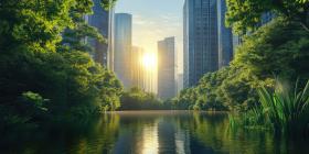 A vibrant metropolis awakens under the golden rays of the rising sun, its towering skyscrapers surrounded by a lush canopy of trees, showcasing the harmonious coexistence of urban life and nature