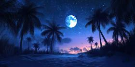 A serene tropical beach scene, bathed in the soft glow of a full moon, with swaying palm trees silhouetted against the starry sky