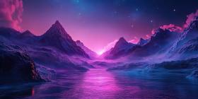 A breathtaking vista of a surreal landscape, where snow-capped mountains rise majestically against a backdrop of a vibrant purple sky, illuminated by a celestial glow