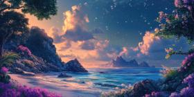A breathtaking vista of a surreal landscape, where snow-capped mountains rise majestically against a backdrop of a vibrant purple sky, illuminated by a celestial glow