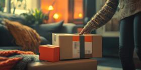 A gloved hand carefully holds a cardboard box, ready to be shipped, representing the connection and joy that gifts and packages bring during the holiday season