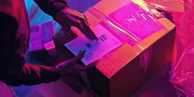 A gloved hand carefully holds a cardboard box, ready to be shipped, representing the connection and joy that gifts and packages bring during the holiday season