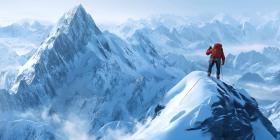 Majestic Mountain Adventure: Explorer in Bright Orange Jacket Stands Tall on a Snowy Peak, Overlooking Rugged Snow-Covered Ranges and Vast Clear Blue Sky