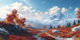A breathtaking panorama of a mountain landscape, where vibrant autumn foliage paints the hillsides in fiery hues