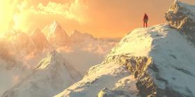 Majestic Mountain Adventure: Explorer in Bright Orange Jacket Stands Tall on a Snowy Peak, Overlooking Rugged Snow-Covered Ranges and Vast Clear Blue Sky