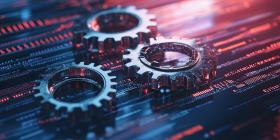 The Engine of Innovation: Cogs interlock amidst a sea of binary code, symbolizing the intricate workings of technology and its relentless march towards progress