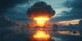 A colossal nuclear explosion erupts, casting a fiery shadow over the landscape, a stark reminder of the devastating power of such weapons