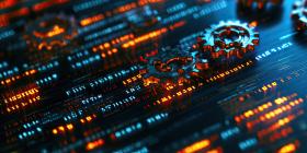 The Engine of Innovation: Cogs interlock amidst a sea of binary code, symbolizing the intricate workings of technology and its relentless march towards progress