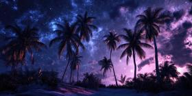 A serene tropical beach scene, bathed in the soft glow of a full moon, with swaying palm trees silhouetted against the starry sky