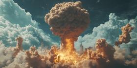 A colossal nuclear explosion erupts, casting a fiery shadow over the landscape, a stark reminder of the devastating power of such weapons