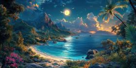 A breathtaking vista of a surreal landscape, where snow-capped mountains rise majestically against a backdrop of a vibrant purple sky, illuminated by a celestial glow
