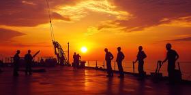 Four Figures in Hard Hats and Work Gear at Sunset on a Maritime Platform with a Vivid Orange, Yellow, and Purple Sky, Ocean in the Background