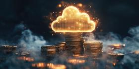 A luminous cloud icon hovers above a towering stack of gold coins, symbolizing the immense value and potential of cloud computing in today's digital landscape