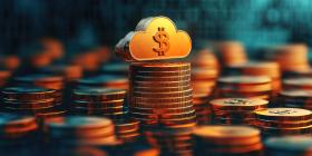 A luminous cloud icon hovers above a towering stack of gold coins, symbolizing the immense value and potential of cloud computing in today's digital landscape